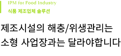 가장 수준 높은 관리와 방제가 필요한 곳은 식품제조시설 입니다. 제조 공정 중 발생 할 수 있는 파리, 나방등의 해충이 식품이나 제품에 혼입 될 경우 기업의 신뢰도와 브랜드이미지에 큰 타격을 줍니다.