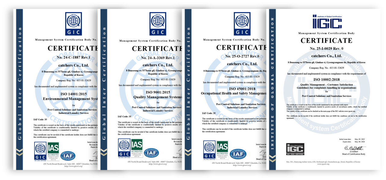 캐처스는 국제 표준화 기구(ISO)로부터 ISO 10002, 9001, 14001, 45001 인증을 획득하여, 환경·품질·안전보건을 체계적으로 관리하며 신뢰도 높은 서비스를 제공합니다.