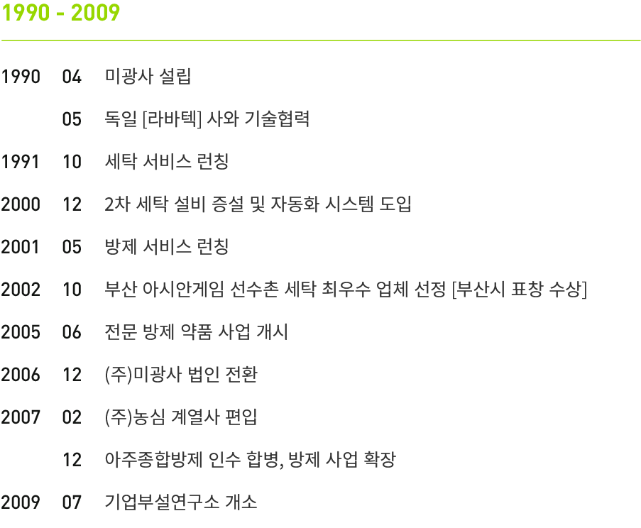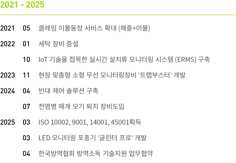 30여 년간 축적해온 노하우를 바탕으로 끊임없는 연구와 혁신을 이어오며, 해충 등 위생 위해 요소를 관리하는 방제 서비스와 프리미엄 호텔을 위한 린넨 전문 세탁 서비스를 제공하는 종합 위생·환경 관리 전문 기업입니다.