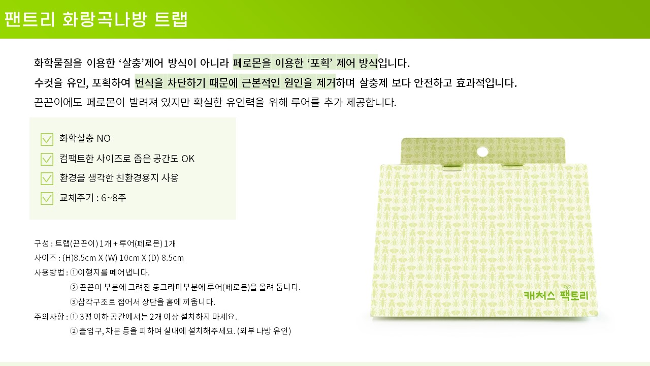 -설치제안장소 : 팬트리 (재료보관함 및 선반), 주방, 음식물 쓰레기통 주변, 싱크대 하부 등